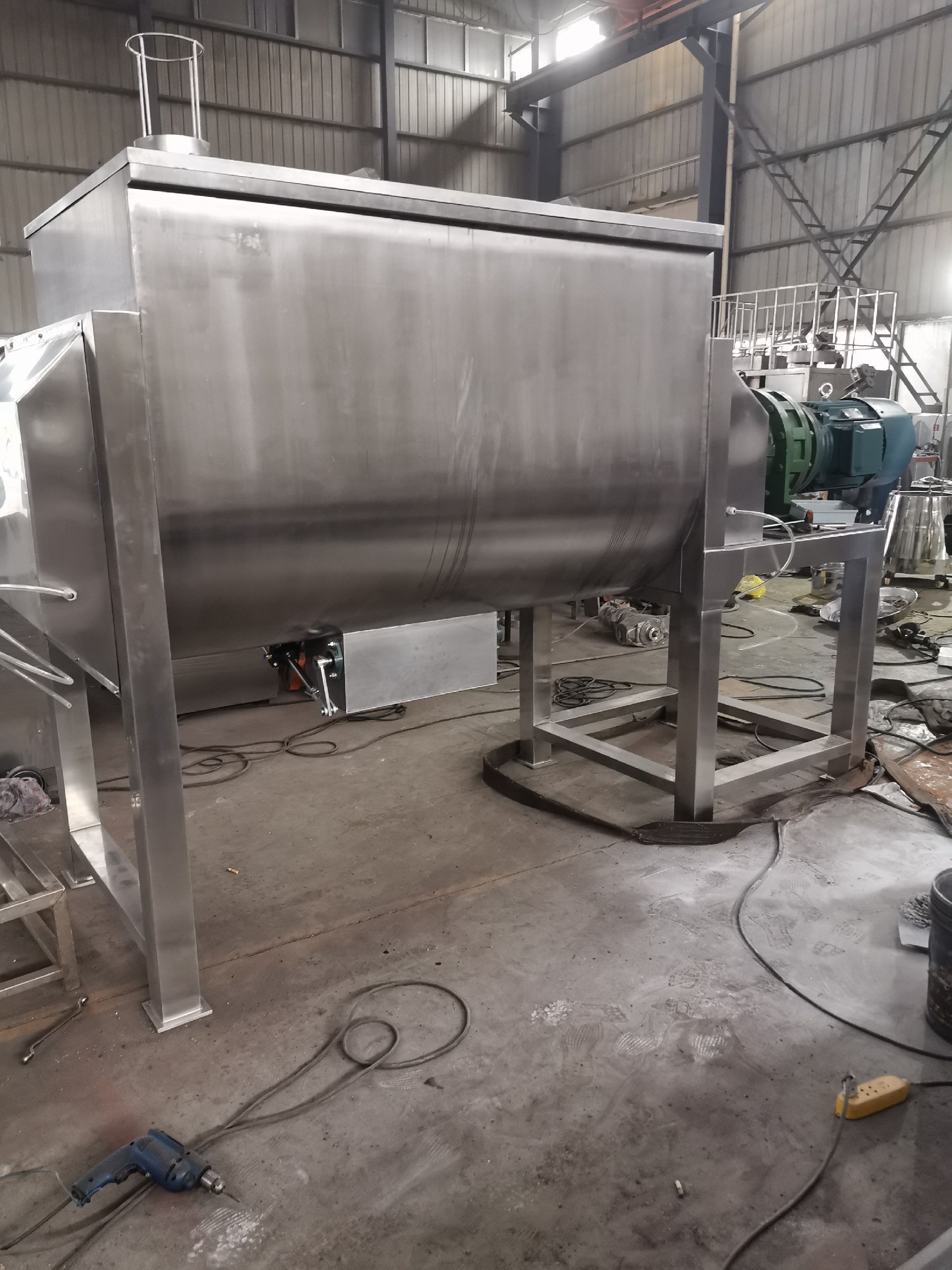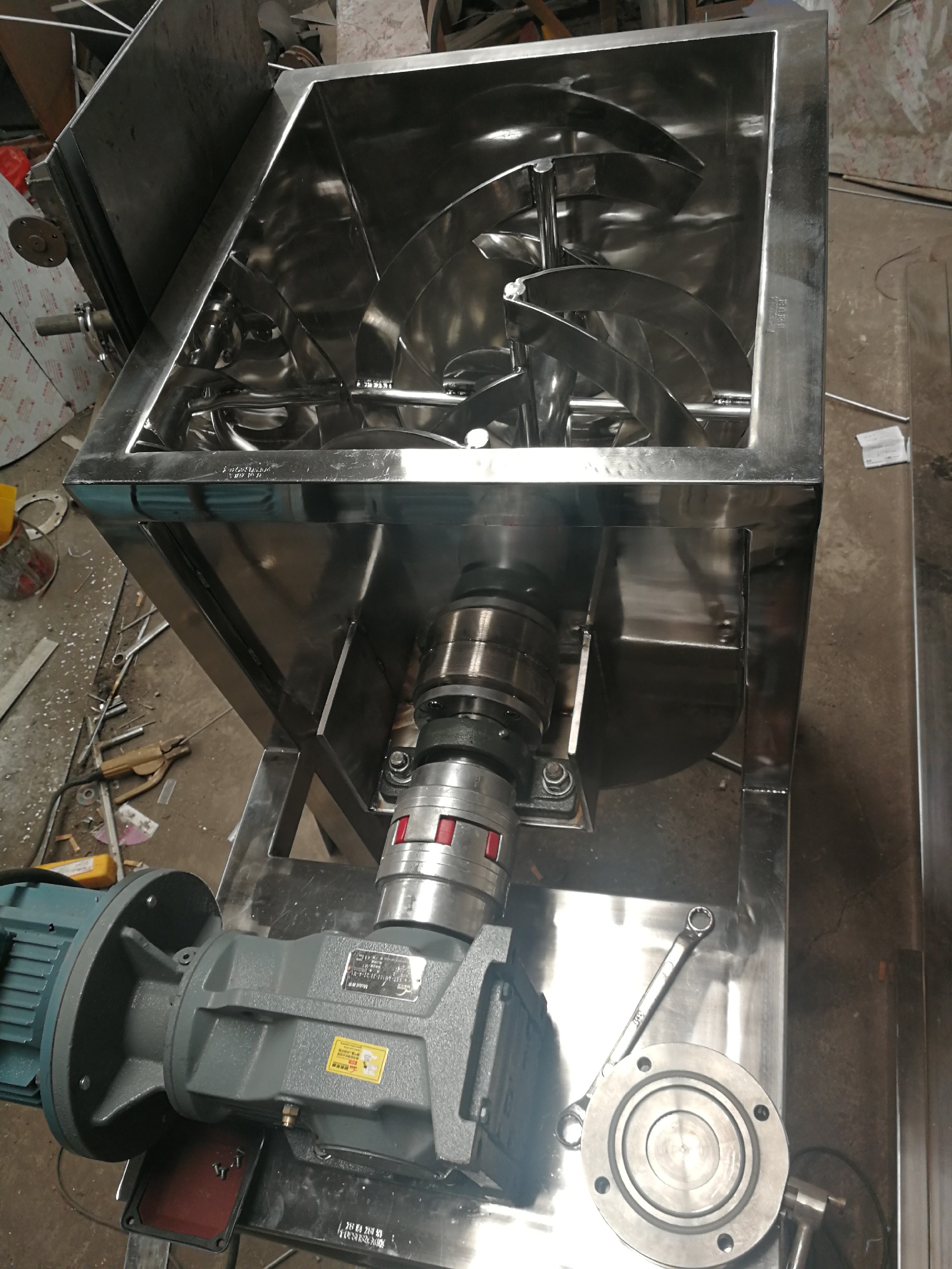 螺帶混合機主要有U形容器、螺帶攪拌葉片和傳動部件所組成的。U形的長體筒體結(jié)構(gòu),保證了被混合物料(粉體、半流體)在筒體內(nèi)的小阻力運動。螺旋葉片一般做成二層,外層螺旋將物料從兩側(cè)向中央?yún)R集,內(nèi)層螺旋將物料從中央向兩側(cè)分流,使物料在混合槽內(nèi)形成對流混合,從而達到高均勻度混合。傳送部件可以減少筒體內(nèi)的阻力運動,方便物料在流動中可以形成更多的渦流,更好的混合在一起。